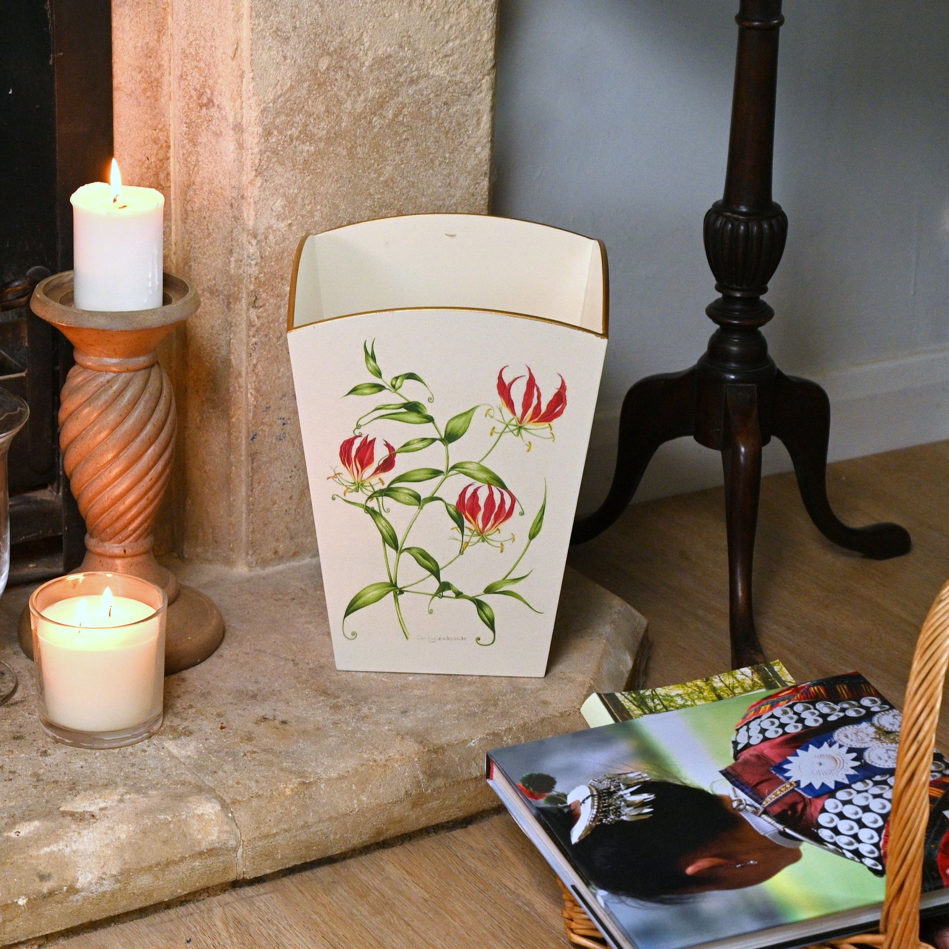 Square Wooden Waste Paper Bin: Flame Lily
